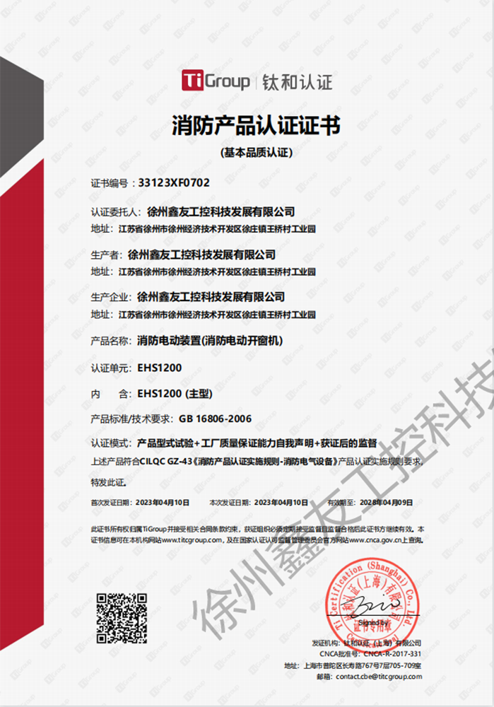 徐州鑫友工控科技發(fā)展有限公司成立于2008年,占地31600平方米,全資子公司:江蘇良紫工程科技有限公司,旗下 有“鑫友”及“MASTER.W主人窗控”兩個品牌系列,公司全面貫徹執(zhí)行IS09001:2015質(zhì)量管理體系標(biāo)準(zhǔn),產(chǎn)品順利通過歐盟CE認(rèn)證和中國***消防電子產(chǎn)品認(rèn)證,通過可燃性粉塵環(huán)境下、爆炸性環(huán)境下防爆合格產(chǎn)品檢驗。排煙天窗整窗通過***消防產(chǎn)品質(zhì)量監(jiān)督檢驗中心檢測。先后獲得多項******及榮譽證書。集研發(fā)、加工、生產(chǎn)、制造、銷售、安裝及售后于一體,是一家高起點、研發(fā)能力強的專業(yè)智能化***技術(shù)企業(yè)。